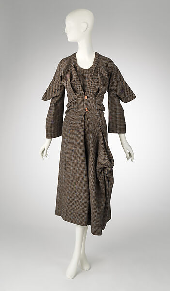 The Witches collection by Vivienne Westwood and Malcolm McLaren for fall/winter 1983–84, marks their last collaboration for their label World's End before Westwood started her eponymous fashion label. This iconic and transitional collection testifies of Westwood's love of historical pastiche as well as her active stance towards current sociopolitical issues. The collection was inspired by American artist Keith Haring's drawings, which inspired the name of the collection because of their esoteric, cult-like qualities. However, this woolen dress with houndstooth motif plays with tropes of British heritage such as tweed and witchcraft. The skirt has a draped inset at the front, giving the silhouette an asymmetrical volume, combined with batwing sleeves tucked in at the elbow: Westwood's expression in cloth of the fluttering of the creatures of the night.