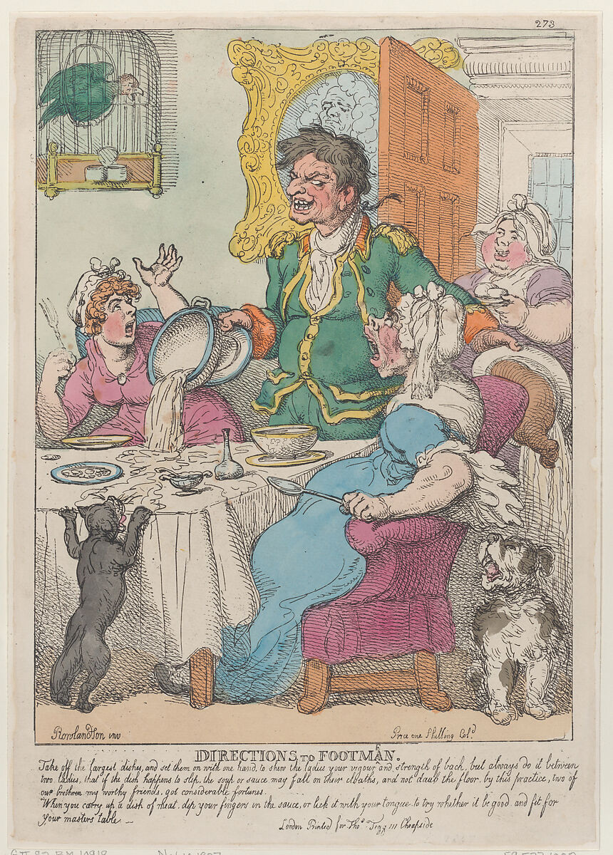 An untidy footman stands by the dinner table and lets a tureen slide on to the table so that its contents pour out. He holds a dish containing a leg of mutton in his left hand, held so that joint and gravy fall to the floor, while a dog waits expectantly at right. The two women at the table look at him, mouths agape.