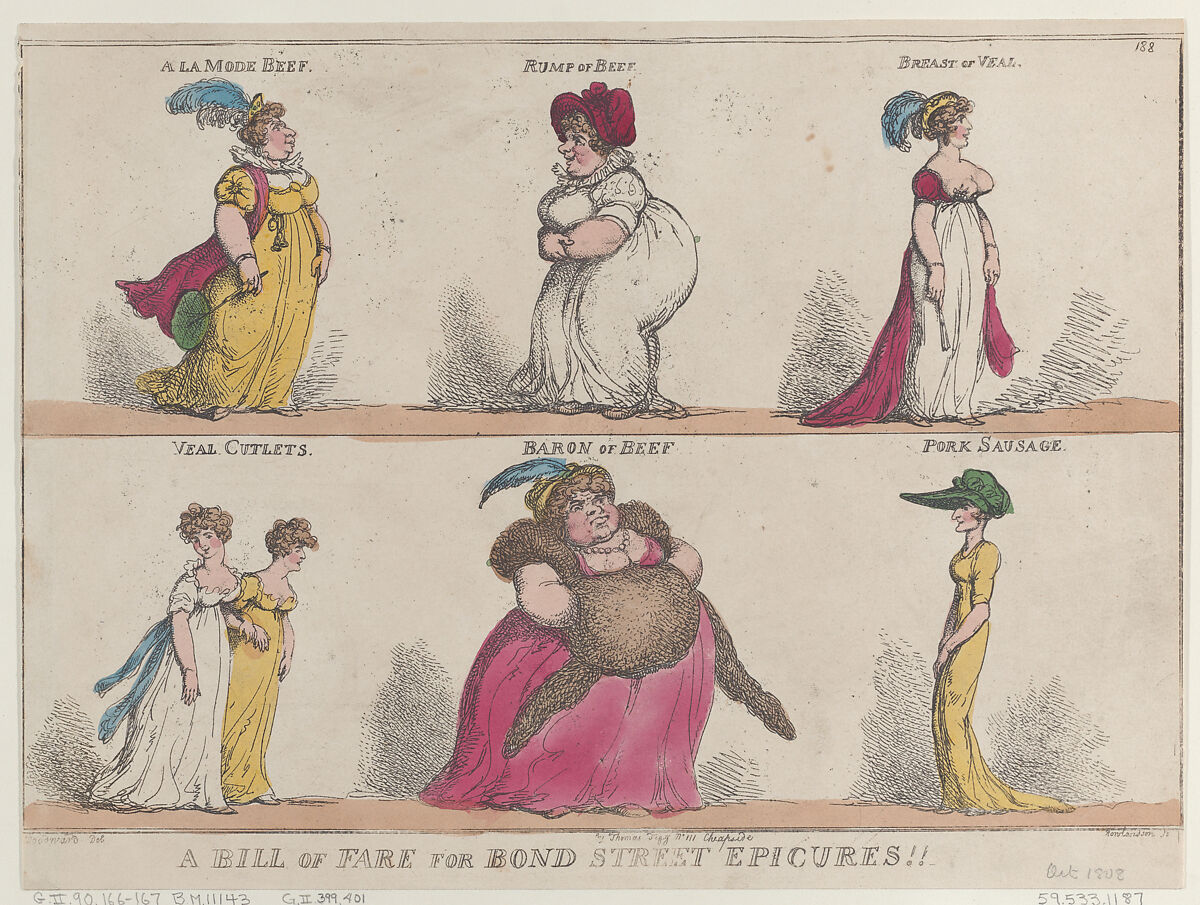 Seven women, probably representing courtesans who paraded in Bond Street, arranged in two rows, each with the captions: "A La Mode Beef," "Rump of Beef," "Breast of Veal," "Veal Cutlets," "Baron of Beef," and "Pork Sausage."