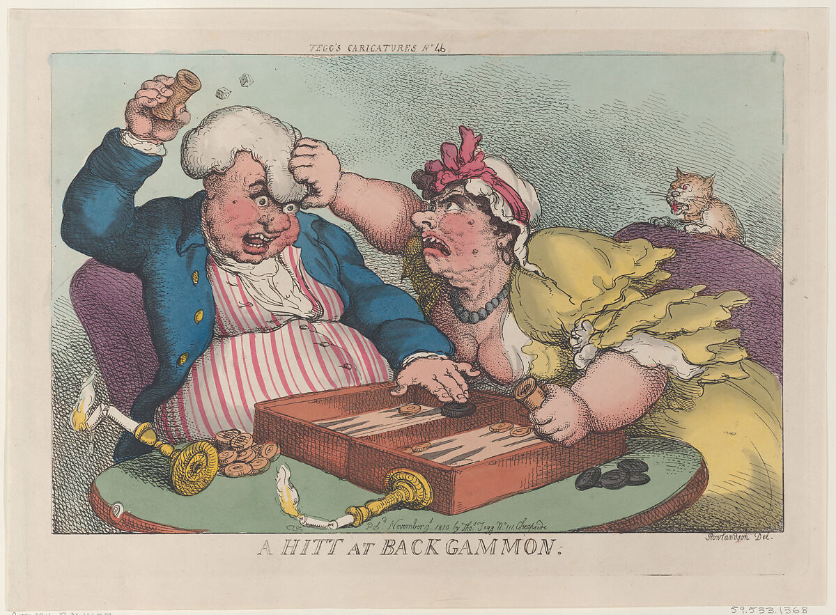 A man and woman play backgammon. The woman at right is frantic with rage, and leans towards the man to seize his wig. Two candlesticks are overturned on the table and a cat meows at the back of her chair.