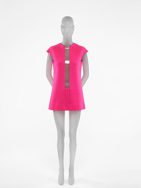 In these Gernreich creations, vertical and horizontal windows—like the zips in a Barnett Newman painting overlaid on a figure—delineate an axis of nudity on the body. These dresses appeared on the cover of "Time" (December 1, 1967) accompanying a story on Gernreich that described him as "the most way-out, far-ahead designer in the U.S." The ensembles exemplify Gernreich's famous declaration: "A woman today can be anything she wants to be—a Gainsborough or a Reynolds or a Reynolds Wrap." Apparently, she can also be a Saran Wrap. (Shown with 1988.74.1a-f in foreground, also by Gernreich.)