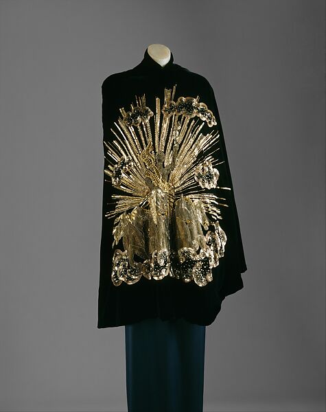 In a sui generis gesture to one client, this velvet cape for Lady Mendl refers to her taste for eighteenth-century style and the spectacular, and celebrates the Apollo Founrtain and its proximity to her house in the Parc de Versailles.