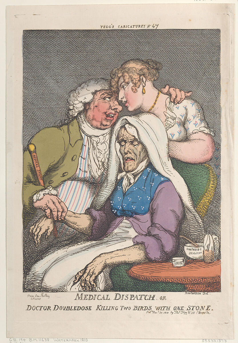 An elderly woman sits in an armchair while a doctor holds her wrist and puts his arm around a young woman who leans on the back of the chair. They gaze into each other's eyes. On the table at the old woman's elbow are medicine vials, a bowl of "Composing Draught," and a pill-box inscribed "Opium." The doctor has a gold-headed cane inscribed "Medical Staff."