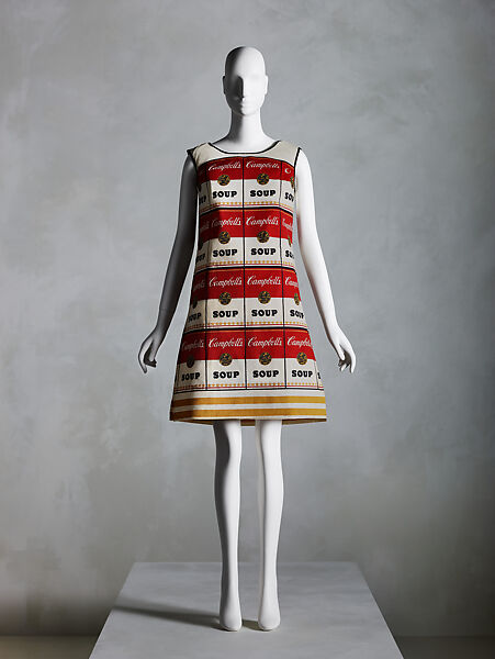 This work of art is currently on loan to the museum.During the mid-1960s a fad for disposable paper dresses emerged, initiated by industrial manufacturers that traditionally operated outside the realm of fashion. These designs typically functioned as promotional vehicles, often to advertise paper products, and were commonly composed from nonwoven patented materials such as Kaycel and Dura-Weve. The populist trend was quickly adopted by high fashion: some designers created bespoke dresses for themed balls and events, while other youth-oriented boutiques, such as Paraphernalia in New York City, produced and sold a variety of their own paper fashions. The democracy of disposable clothing was unique, tapping into the zeitgeist of the mid to late 1960s and captivating public imagination, including that of the artist Andy Warhol, who notably produced several customized paper dresses of his own. While this “Souper” dress from Schreier’s collection is not one of Warhol’s designs, the Campbell Soup Company cleverly capitalized on public knowledge of the pop artist’s work to promote sales via mail-order campaign.
