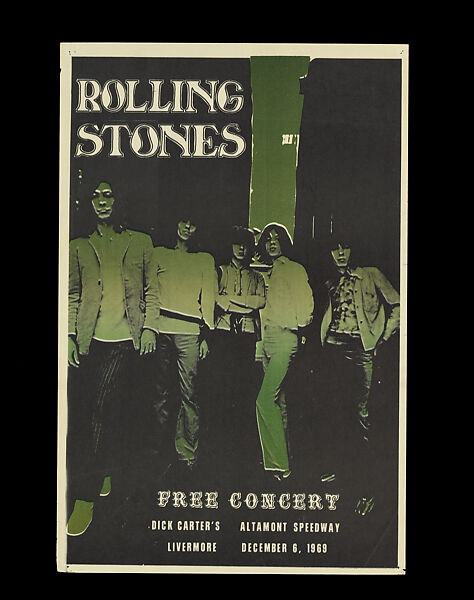 This work of art is currently on loan to the museum.Intended to be a "Woodstock of the West," the free concert featuring Santana, Jefferson Airplane, the Grateful Dead, and the Rolling Stones advertised here devolved into chaos when a security force of Hells Angels began to clash with audience members. During the Stones performance, an escalation of violence led to the death of attendee Meredith Hunter.