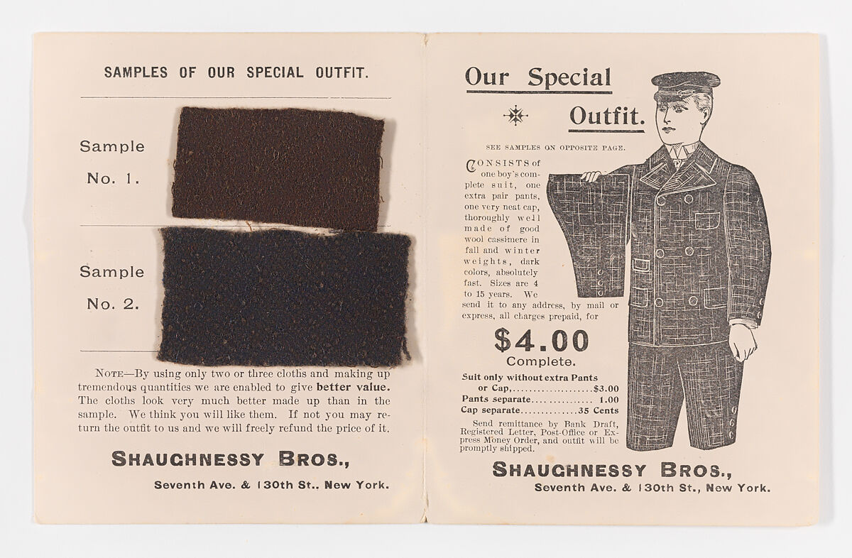 Issued by a Harlem clothier at Seventh Avenue and 130th Street, this flyer notes that "by using only two or three cloths and making up tremendous quantities we are enabled to give better value." Here they offer a boy’s suit with two sets of trousers for $4.00.