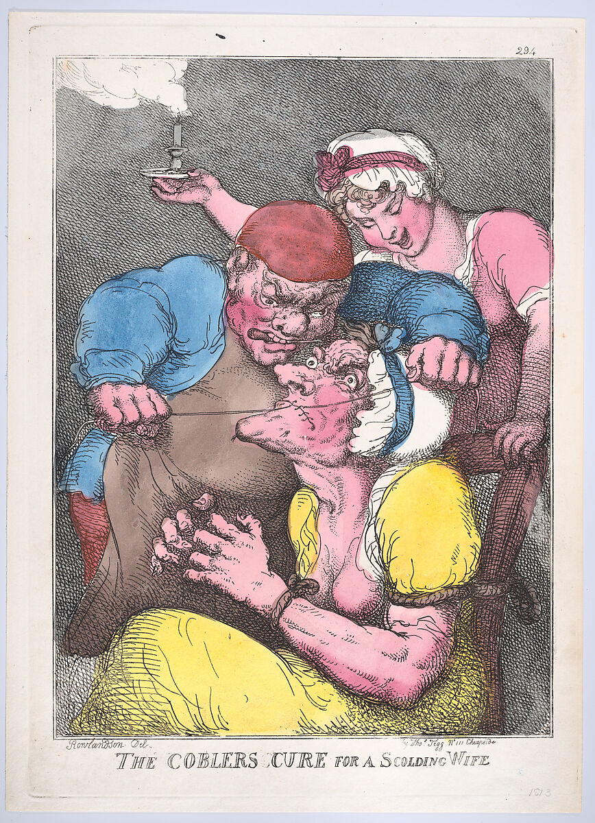 The cobbler leans over his wife who is tied to a chair with her wrists bound. With his awl between his teeth he pulls at the threads with which he is stitching up her mouth. Another woman holds a candle over them at right.