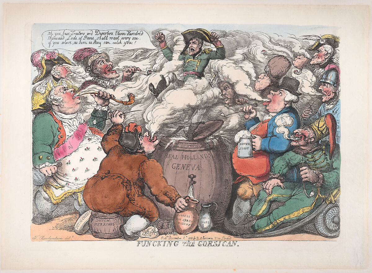 Napoleon, frantic with fear and rage, dances on the lid of a large cask marked "Real Hollands Geneva." He is surrounded by figures who represent the powers of Europe (Spain, Portugal, Hanover, a Cossack, a Pole, Austria, Sweden, Bavaria, Prussia, the King of Wurtemburg, a Dutchman), now all turned against him and puffing smoke at him. The cask lid tilts and he is about to fall in.