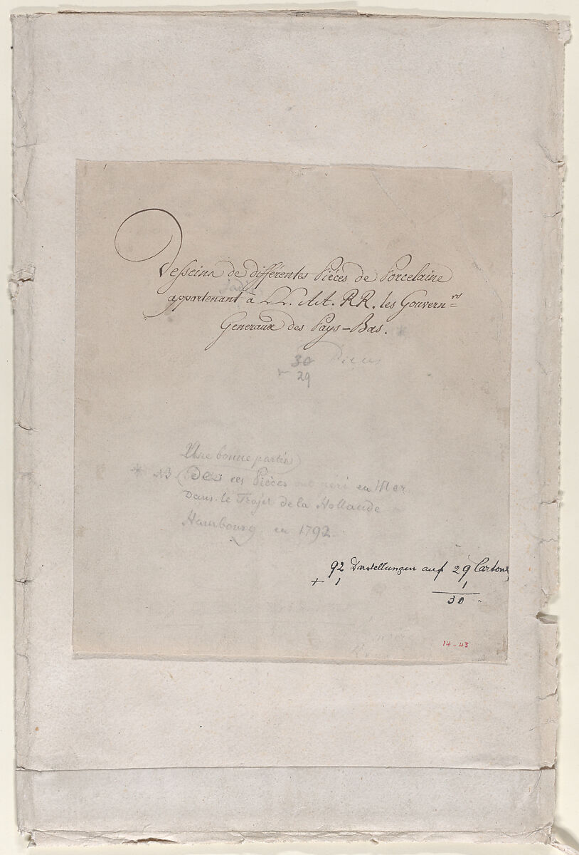 Portfolio cover consisting of a folio sheet of paper, folded double. On the front cover, a sheet of paper has been attached with descriptive titles in both French and German in different hands. On the verso of this sheet is another German inscription, in yet another hand. The folio appears to be a reused sheet which was formerly part of an album. On the verso of the cover is a modern inscription in German referring to a drawing or print that was taken out and refiled under the Rembrandt School (Eeckhout). The portfolio was used to house a group of 18th-century drawings, predominantly of porcelain vessels, which were sent to Albert, Duke of Saxe-Teschen and the Archduchess Maria Christine, governors of Belgium from 1780-1790, to show the latest designs available in Paris, Vienna, and England and to choose objects for the decoration of the Chateau de Laeken (outside Brussels in the area formerly called Schoonenberg, now the Belgian Royal Palace).