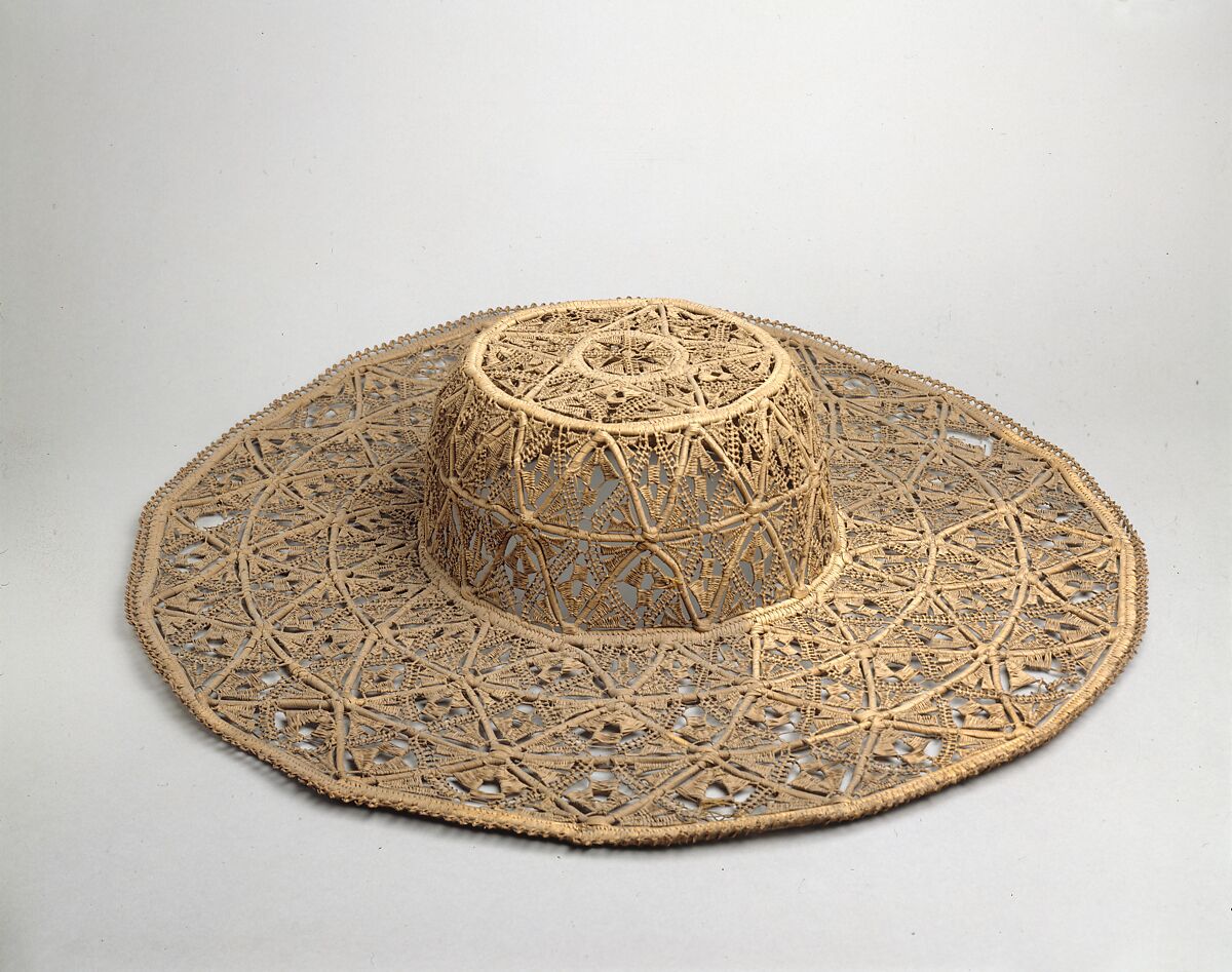 This group of hats has generally been associated with the Italian straw-hat industry, and as early as 1590 Cesare Vecellio in Habiti Antichi et Moderni illustrates a huge, crownless straw brim, on which a fashionable Venetian lady might spread out her hair to bleach it in the sun, while shading her face. In England, in 1667, Samuel Pepys records a visit to Hatfield, where the ladies "had pleasure in putting on some straw hats," and in 1722 the Post Boy newspaper reported" a fine straw hat presented to the Princess," with which she was so pleased that she ordered twelve more. Where illustrated, however, these hats seem quite unlike the shape and openwork style of this example.