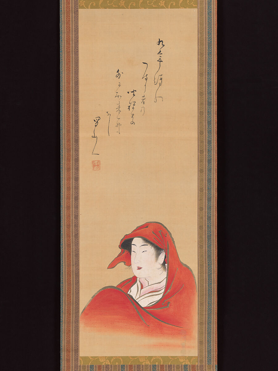 Though a painting of a young woman, the red cape and cowl are associated with traditional imagery of Daruma (Bodhidharma), the legendary monk who traveled from India to China to establish Chan (Zen) Buddhism, who is often depicted in similar garb. The painting here, unsigned but most likely by Toyoharu based on stylistic considerations, is intended as a parodic depiction of a Yoshiwara courtesan. The poem by Shokusanjin plays on Buddhist phrases related to the Daruma’s nine years of zazen meditation in a cave to connote a drinking party.