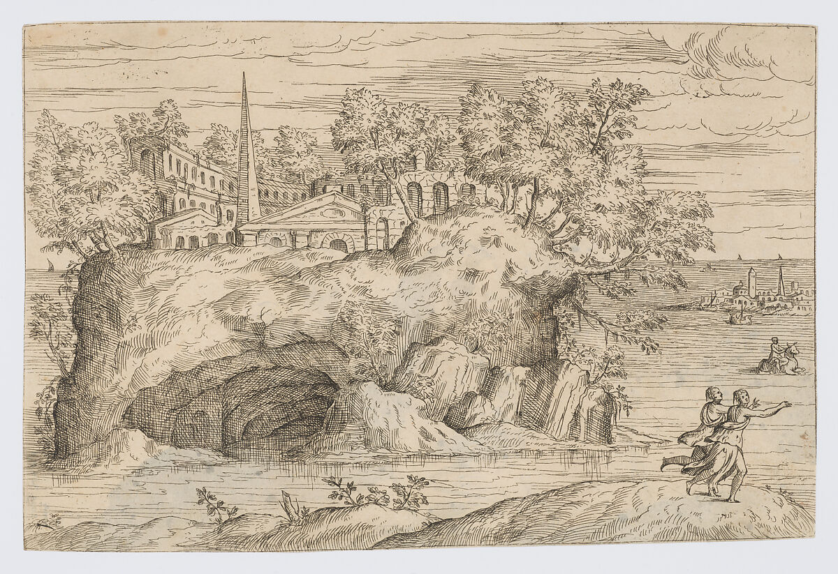This etching depicts an antique landscape with at its center an island filled with ruins of Classical architecture. In the foreground at right, two figures are depicted on a different shore, who are seemingly running away. On the right side of the sheet, in the background, another island is depicted, reminiscent of those in the Veneto, and in the water the Greek goddess Europa is being carried away by Zeus in the guise of a bull. The print was made by Giovanni Battista Pittoni the Elder, and is part of a series depicting myths from Classical Antiquity. They were published in 1585 by Francesco Ziletti under the title "Imagini Favolose", but had likely been published previously by Pittoni himself. Pittoni is principally known for his prints depicting landscapes, some after the Venetian artist Titian, but many seemingly of his own design. His prints containing views of ancient Roman architecture were used in Vincenzo Scamozzi’s "Discorsi Sopra L’Antichita di Roma", which is arguably one of Pittoni’s best-known achievements. The "Imagini Favolose" are less famous, but speak to his virtuosity in this particular genre. While the title of the print series indicates that the ancient myths are the subject of the prints, in most cases the landscapes are foregrounded by the artist.