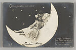 At the height of the picture postcard craze in the early twentieth century, photo studios at beach resorts, state fairs, carnivals, and downtown arcades offered a variety of playful props and backdrops for sitters to pose against. During the same period, there was a resurgence of popular interest in the romance of the Moon, as evidenced in countless Tin Pan Alley songs, such as "Shine On, Harvest Moon" (1908), "By the Light of the Silvery Moon" (1909), and "I’ll Sit Right on the Moon and Keep My Eyes on You" (1912). Given this confluence, it is not surprising that one of the most popular studio props was the "paper moon," a cut-out crescent moon set in front of a backdrop painted with stars and the occasional comet (inspired by the passing of Halley’s comet in 1910). Decades before the first spacecraft were launched into orbit, thousands of individuals commemorated their own imaginary lunar voyages with these charming photographic souvenirs.
