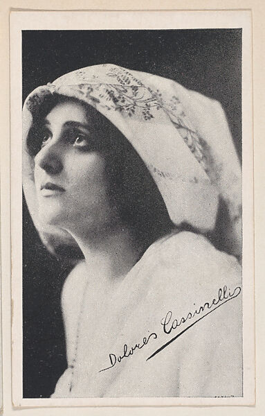 Dolores Cassinelli from "Leading Moving Picture Stars" (W623). Issued ca. 1917 by Kromo Gravure Photo Company, Detroit, Michigan. Several sets of photos of early silent film screen stars were available over the counter in packages/ boxed sets of 50 unnumbered cards for a dime. Cards were sold to other companies for their movie card promotions. Blank back or may include advertising information. Black and white images with white borders. Facsimile signatures. Printed on heavy paper stock. Kromo Gravure and title -- "Leading Moving Picture Stars" -- printed on box.