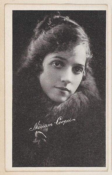 Miriam Cooper from "Leading Moving Picture Stars" (W623). Issued ca. 1917 by Kromo Gravure Photo Company, Detroit, Michigan. Several sets of photos of early silent film screen stars were available over the counter in packages/ boxed sets of 50 unnumbered cards for a dime. Cards were sold to other companies for their movie card promotions. Blank back or may include advertising information. Black and white images with white borders. Facsimile signatures. Printed on heavy paper stock. Kromo Gravure and title -- "Leading Moving Picture Stars" -- printed on box.