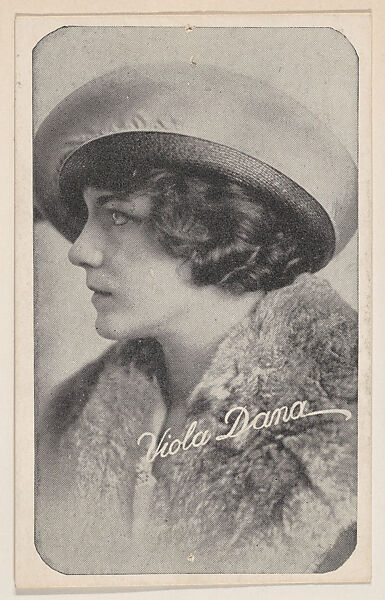 Viola Dana from "Leading Moving Picture Stars" (W623). Issued ca. 1917 by Kromo Gravure Photo Company, Detroit, Michigan. Several sets of photos of early silent film screen stars were available over the counter in packages/ boxed sets of 50 unnumbered cards for a dime. Cards were sold to other companies for their movie card promotions. Blank back or may include advertising information. Black and white images with white borders. Facsimile signatures. Printed on heavy paper stock. Kromo Gravure and title -- "Leading Moving Picture Stars" -- printed on box. From "Rounded Corners Set".
