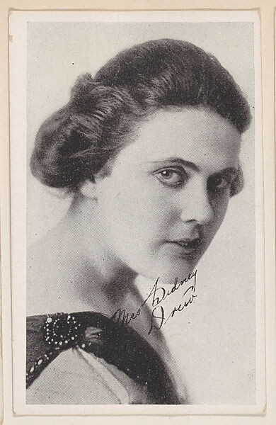 Mrs. Sidney Drew from "Leading Moving Picture Stars" (W623). Issued ca. 1917 by Kromo Gravure Photo Company, Detroit, Michigan. Several sets of photos of early silent film screen stars were available over the counter in packages/ boxed sets of 50 unnumbered cards for a dime. Cards were sold to other companies for their movie card promotions. Blank back or may include advertising information. Black and white images with white borders. Facsimile signatures. Printed on heavy paper stock. Kromo Gravure and title -- "Leading Moving Picture Stars" -- printed on box.