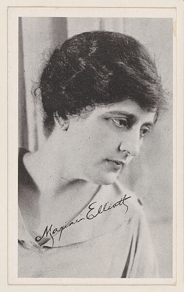 Maxine Elliott from "Leading Moving Picture Stars" (W623). Issued ca. 1917 by Kromo Gravure Photo Company, Detroit, Michigan. Several sets of photos of early silent film screen stars were available over the counter in packages/ boxed sets of 50 unnumbered cards for a dime. Cards were sold to other companies for their movie card promotions. Blank back or may include advertising information. Black and white images with white borders. Facsimile signatures. Printed on heavy paper stock. Kromo Gravure and title -- "Leading Moving Picture Stars" -- printed on box.