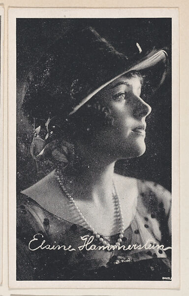 Elaine Hammerstein from "Leading Moving Picture Stars" (W623). Issued ca. 1917 by Kromo Gravure Photo Company, Detroit, Michigan. Several sets of photos of early silent film screen stars were available over the counter in packages/ boxed sets of 50 unnumbered cards for a dime. Cards were sold to other companies for their movie card promotions. Blank back or may include advertising information. Black and white images with white borders. Facsimile signatures. Printed on heavy paper stock. Kromo Gravure and title -- "Leading Moving Picture Stars" -- printed on box.
