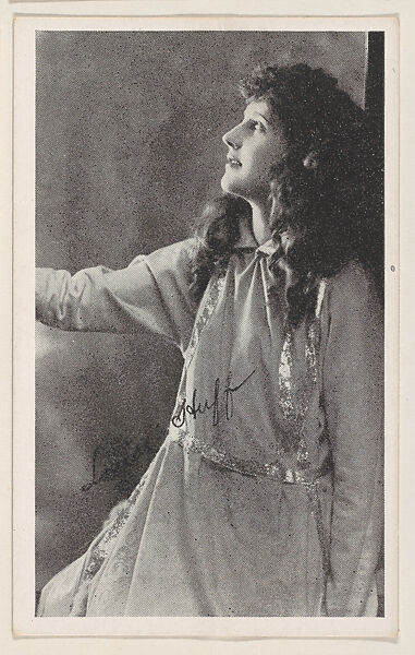 Louise Huff from "Leading Moving Picture Stars" (W623). Issued ca. 1917 by Kromo Gravure Photo Company, Detroit, Michigan. Several sets of photos of early silent film screen stars were available over the counter in packages/ boxed sets of 50 unnumbered cards for a dime. Cards were sold to other companies for their movie card promotions. Blank back or may include advertising information. Black and white images with white borders. Facsimile signatures. Printed on heavy paper stock. Kromo Gravure and title -- "Leading Moving Picture Stars" -- printed on box.