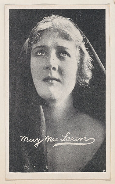 Mary MacLaren from "Leading Moving Picture Stars" (W623). Issued ca. 1917 by Kromo Gravure Photo Company, Detroit, Michigan. Several sets of photos of early silent film screen stars were available over the counter in packages/ boxed sets of 50 unnumbered cards for a dime. Cards were sold to other companies for their movie card promotions. Blank back or may include advertising information. Black and white images with white borders. Facsimile signatures. Printed on heavy paper stock. Kromo Gravure and title -- "Leading Moving Picture Stars" -- printed on box.