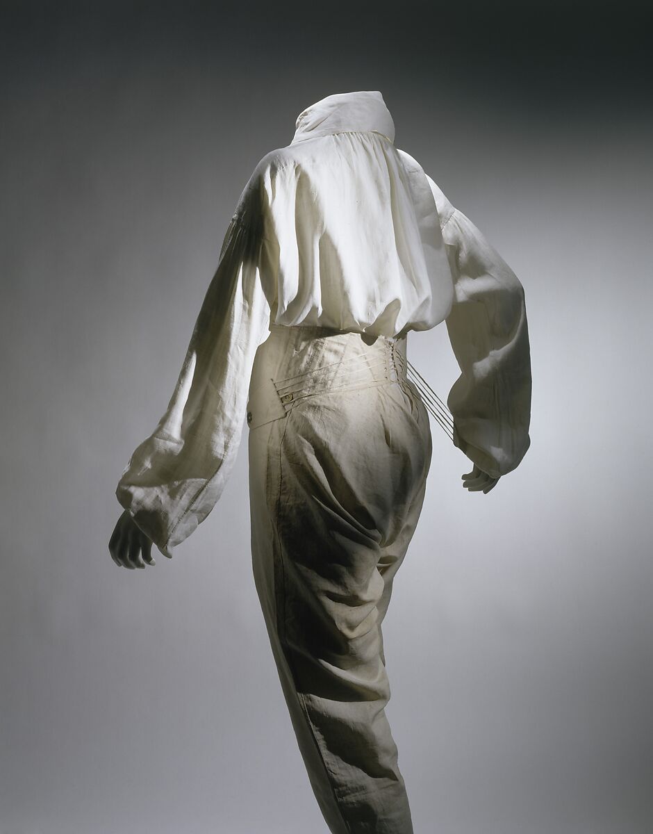 While the mechanisms employed by men to achieve the effect of a slender waist were not too different from those subscribed to by their women contemporaries, not all small waists were the consequence of corseting. This rare early nineteenth-century example of a man's drawers shows a less draconian mode of waist suppression. A double-layered waist yoke with boning functions as a girdle with adjustable laced tabs.