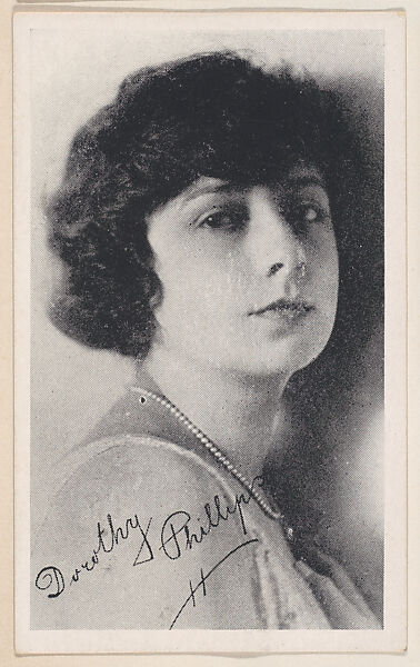 Dorothy Phillips from "Leading Moving Picture Stars" (W623). Issued ca. 1917 by Kromo Gravure Photo Company, Detroit, Michigan. Several sets of photos of early silent film screen stars were available over the counter in packages/ boxed sets of 50 unnumbered cards for a dime. Cards were sold to other companies for their movie card promotions. Blank back or may include advertising information. Black and white images with white borders. Facsimile signatures. Printed on heavy paper stock. Kromo Gravure and title -- "Leading Moving Picture Stars" -- printed on box.