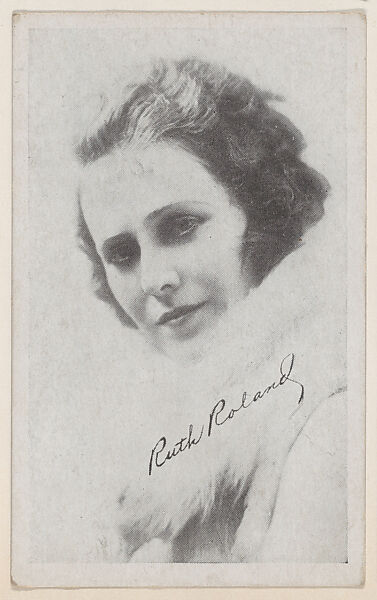 Ruth Roland from "Leading Moving Picture Stars" (W623). Issued ca. 1917 by Kromo Gravure Photo Company, Detroit, Michigan. Several sets of photos of early silent film screen stars were available over the counter in packages/ boxed sets of 50 unnumbered cards for a dime. Cards were sold to other companies for their movie card promotions. Blank back or may include advertising information. Black and white images with white borders. Facsimile signatures. Printed on heavy paper stock. Kromo Gravure and title -- "Leading Moving Picture Stars" -- printed on box.