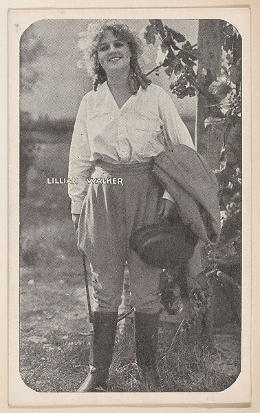 Lillian Walker (full length) from "Leading Moving Picture Stars" (W623). Issued ca. 1917 by Kromo Gravure Photo Company, Detroit, Michigan. Several sets of photos of early silent film screen stars were available over the counter in packages/ boxed sets of 50 unnumbered cards for a dime. Cards were sold to other companies for their movie card promotions. Blank back or may include advertising information. Black and white images with white borders. Star name printed in all caps. Printed on heavy paper stock. Kromo Gravure and title -- "Leading Moving Picture Stars" -- printed on box. From the "Rounded Corners Set ".