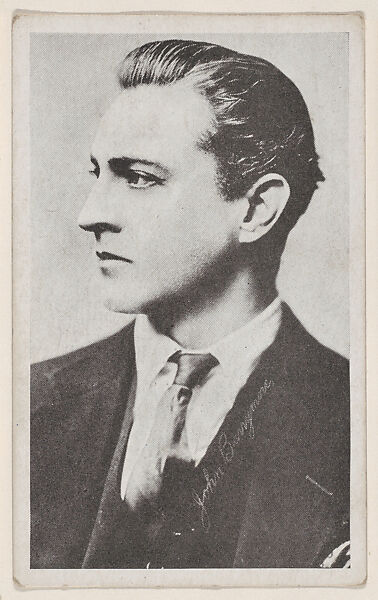 John Barrymore from "Leading Moving Picture Stars" (W623). Issued ca. 1917 by Kromo Gravure Photo Company, Detroit, Michigan. Several sets of photos of early silent film screen stars were available over the counter in packages/ boxed sets of 50 unnumbered cards for a dime. Cards were sold to other companies for their movie card promotions. Blank back or may include advertising information. Black and white images with white borders. Facsimile signatures. Printed on heavy paper stock. Kromo Gravure and title -- "Leading Moving Picture Stars" -- printed on box.