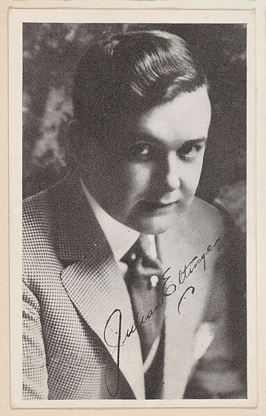 Julian Ettinger from "Leading Moving Picture Stars" (W623). Issued ca. 1917 by Kromo Gravure Photo Company, Detroit, Michigan. Several sets of photos of early silent film screen stars were available over the counter in packages/ boxed sets of 50 unnumbered cards for a dime. Cards were sold to other companies for their movie card promotions. Blank back or may include advertising information. Black and white images with white borders. Facsimile signatures. Printed on heavy paper stock. Kromo Gravure and title -- "Leading Moving Picture Stars" -- printed on box.