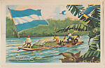 Nicaragua from Good Neighbors of the Americas Educational Pictures (W608-1). Published by D. Robbins & Co., New York City. Front: hand-drawn color reproduction which includes flag of country. White border. Back includes text regarding highlighted country. #4. Lower right in image: CH. ROSNER.