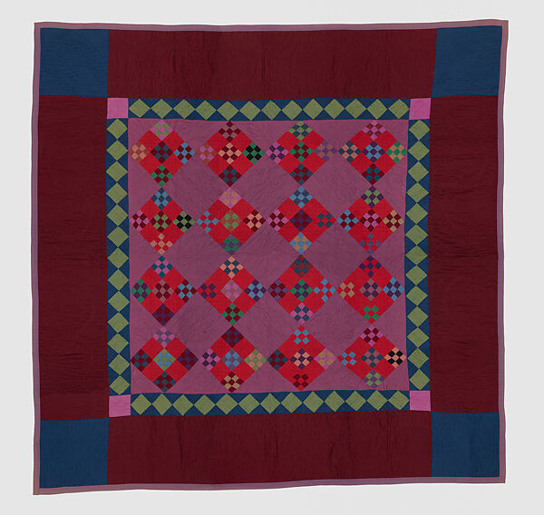 This beautiful Lancaster County Amish Double Nine-patch quilt, with its richly saturated colors, dynamic pattern, and immaculate craftsmanship, is a wonderful addition to the museum’s outstanding Amish quilt collection, and rounds out the group by representing one more of the most classic patterns. The American Wing has collected Amish quilts from both the original Lancaster County, Pennsylvania community (1973.94, 1973.124, 1973.157, and 2004.26) and the communities that later settled in the Midwest (1988.128, 2003.188, 2003.312, 2003.313, 2004.418.2). Lancaster County Amish quilts are designed in a limited number of patterns. Fewer than ten designs are considered acceptable and in accordance with the Ordnung, or set of rules that are followed by this most conservative branch of the religious group. In this Double Nine-patch, the central field is composed of square blocks set on point to create diamond shapes. The blocks alternate between multicolored wool double nine-patch blocks and plain lavender-colored wool blocks, which are hand quilted with interlocking ring forms. The central field is outlined with a narrow border of green diamonds edged with blue triangles. The wider outer border is made up of broad bands brick-colored wool on all four sides, with contrasting corner blocks in dark blue. The wide outer border is decorated with classic Amish feather vine quilting. The quilt is backed with a printed small scale checked brown and beige cotton fabric.
