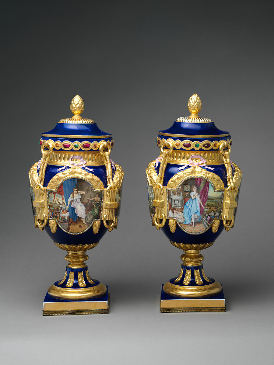 These vases provide a rich iconographic narrative of a particular world view from from the point of view of a worldly American statesman in the late nineteenth century, as exemplified by the eight allegorical vignettes. They were decorated by Joseph S. Potter, an American diplomat, while he was stationed in Germany, during the late 1870s and 1880s. The vases were made in an unidentified European factory and their shapes are based on a sumptuous mid- to late-eighteenth century Sèvres form (Vase ferré). They feature a rich blue ground and are elaborately gilded. Their main interest, however, is the group of eight meticulously painted vignettes (four on each vase) depicting allegorical figures and attributes of the New and Old Worlds (Old World, Asia, Africa, and Europe; New World, North America, South America, and Australia).