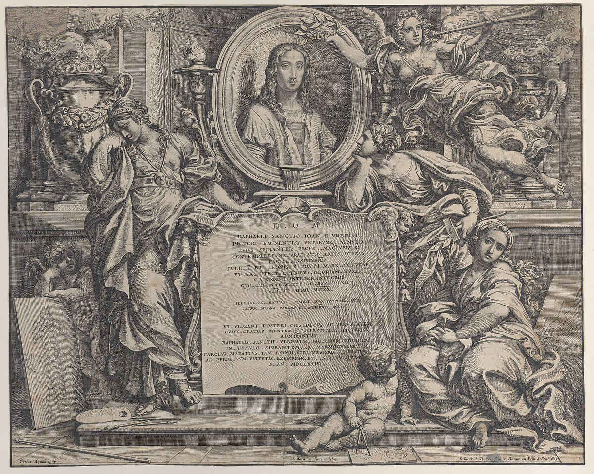 - Title: Frontispiece with oval portrait of Raphael, with three allegorical figures of the Arts supporting the tablet at center