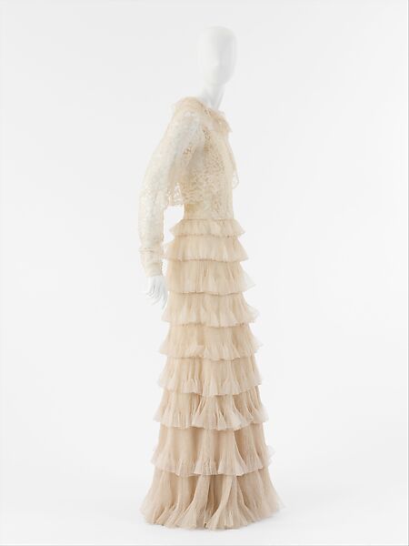 In tune with the fashions of the 1930s, Chanel went through what has been called her "romantic" period, typified by lace and tulle gowns with skirt ruffles or flounces. Although the clothes are seemingly antimodern in their aesthetic, Chanel asserted their modernity by revealing and emphasizing the techniques of their construction, such as vertical overstitching to hold the soft lace tiers in fixed flounces. By using the virtuoso hand-sewn details of the couture as both structural and decorative devices, Chanel was responding to the clarion call of modernism that required design to speak of utility and truth to materials.