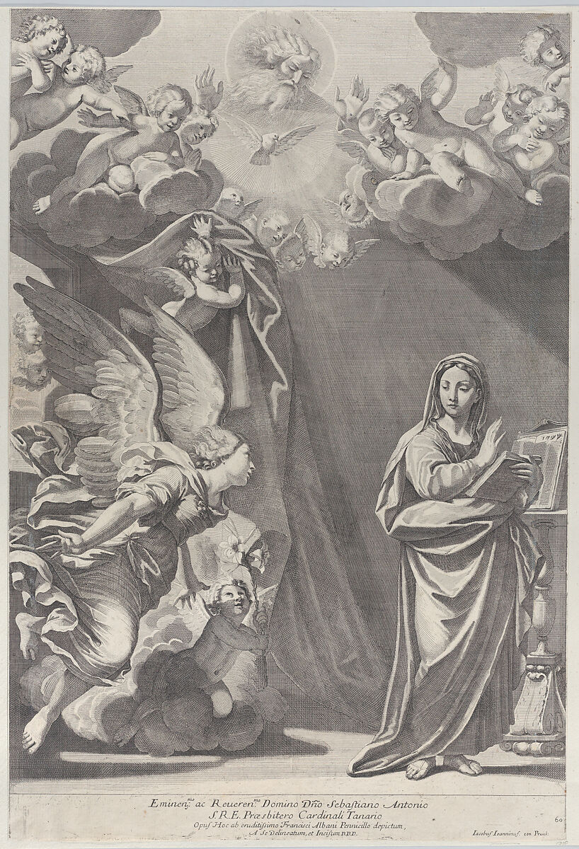 - Title: The Annunciation, with Gabriel and other angels at left and God the Father above