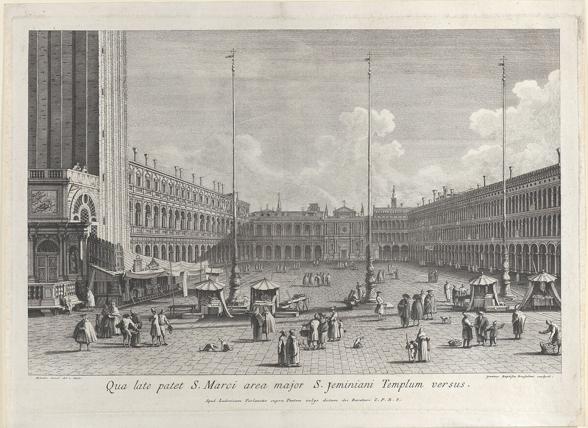 - Title: View of Piazza San Marco, with the church of San Geminiano at the far end, and figures and market stalls in the foreground