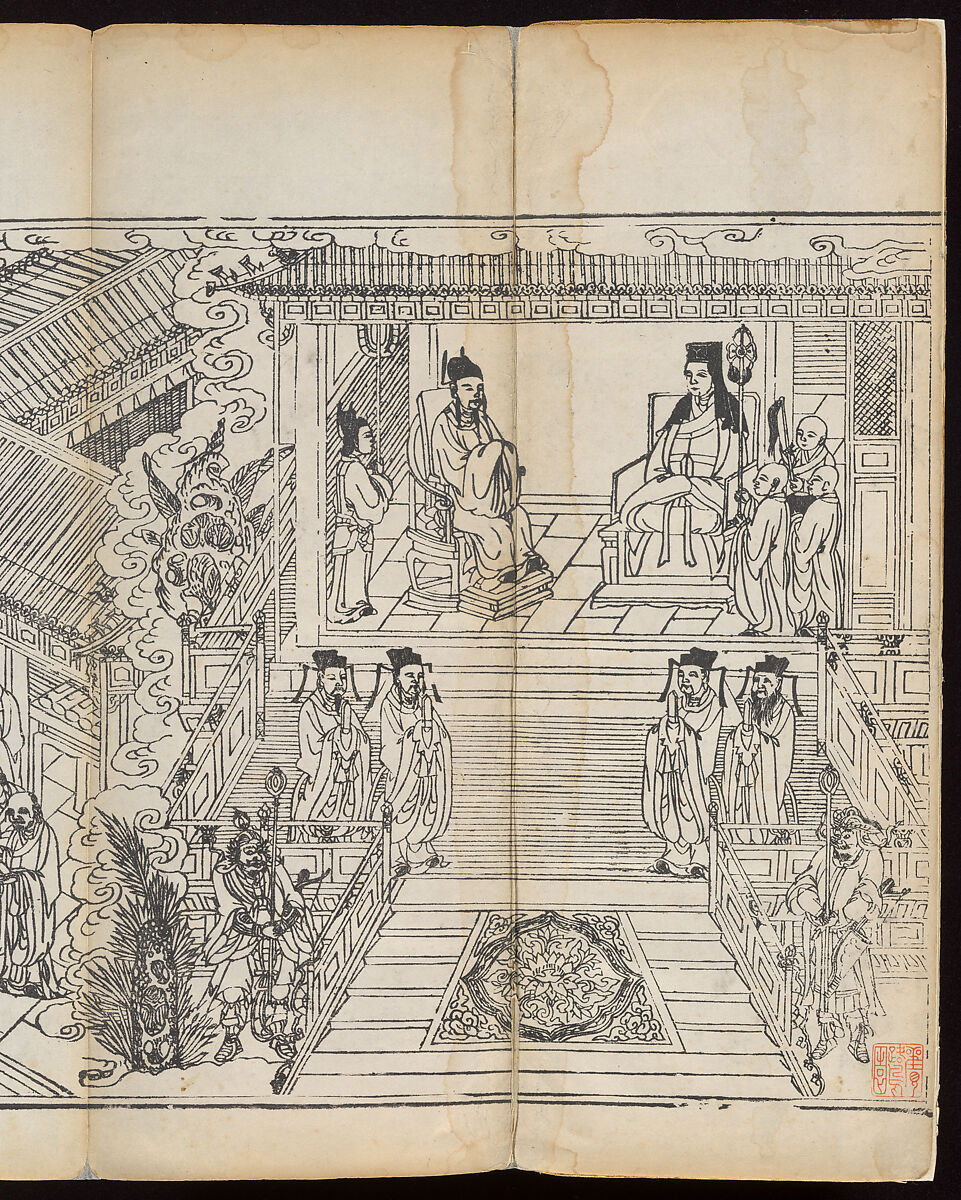 Printed sutras usually took the form of accordion-fold books, and they often featured an illustrated frontispiece. Legend states that the repentance ritual described in this sutra was instituted by Emperor Wu of Liang (464–549) to deliver his deceased wife from an unpleasant reincarnation as a python. This is the story depicted in the illustrated frontispiece, where a group of Buddhist monks industriously undertake the rituals prescribed in the sutra. The empress’s spirit floats free from the mouth of the snake, ascending heavenward on a cloud.