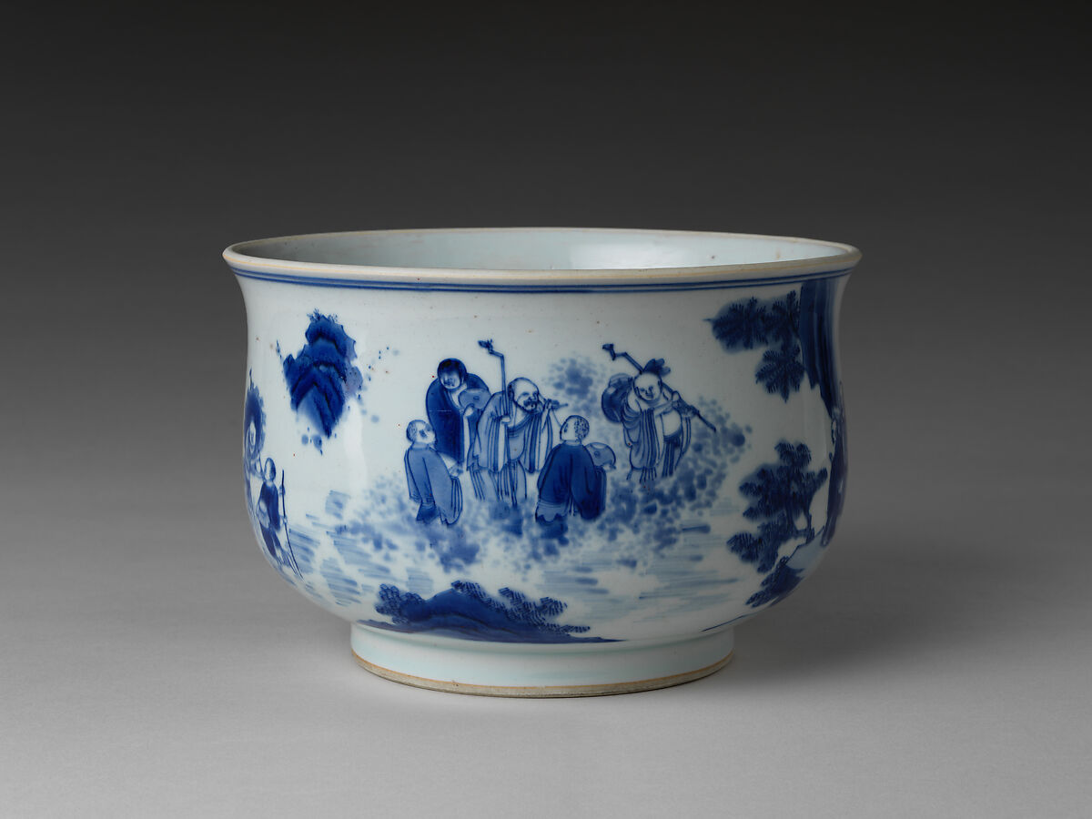 This ceramic vessel captures both the playfulness and power of the luohans (arhats). At right, one luohan fords a river on the back of a tiger while his companion hails a flying dragon; at left, more luohans welcome their companions, who arrive on floating clouds. This piece was produced under the short-lived Southern Ming dynasty, a remnant court that fled to the south after the Qing dynasty had been established in the north. Dated ceramics from the Southern Ming are extremely rare.