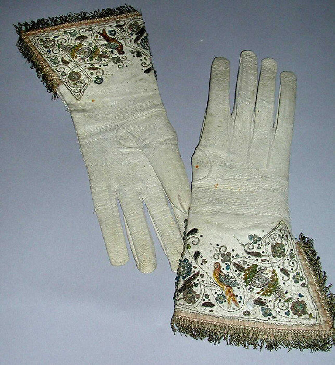 During the seventeenth century, elaborately embroidered gloves were commissioned to be made as presents for distinguished visitors, patrons, and heads of state. Their status as purely decorative objects, rather than practical everyday wear, has resulted in the survival of an unusually large number of gloves of this type.