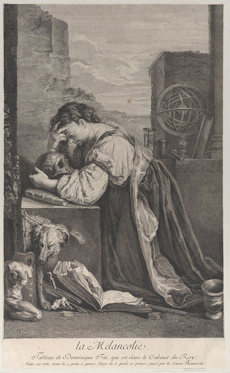 - Title: Allegory on Melancholy, with a woman kneeling towards the left holding a skull