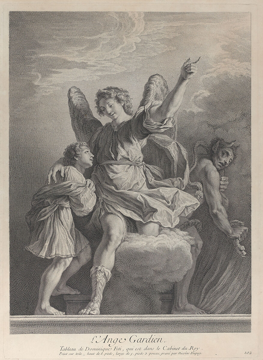 - Title: The Guardian Angel, stepping off a cloud and putting his arm around a young boy at left while a demon walks away at right