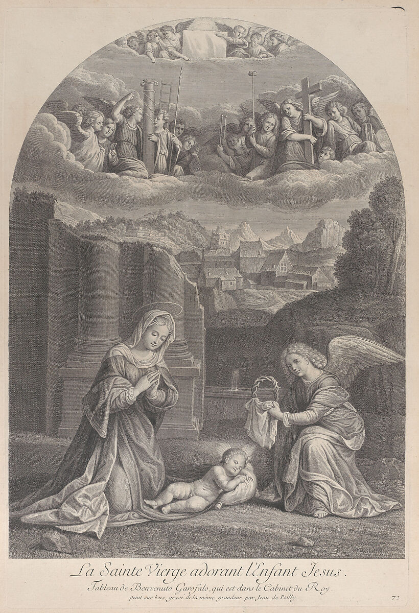 - Title: The Virgin Mary adoring the Christ child, an angel holding a crown of thorns at right