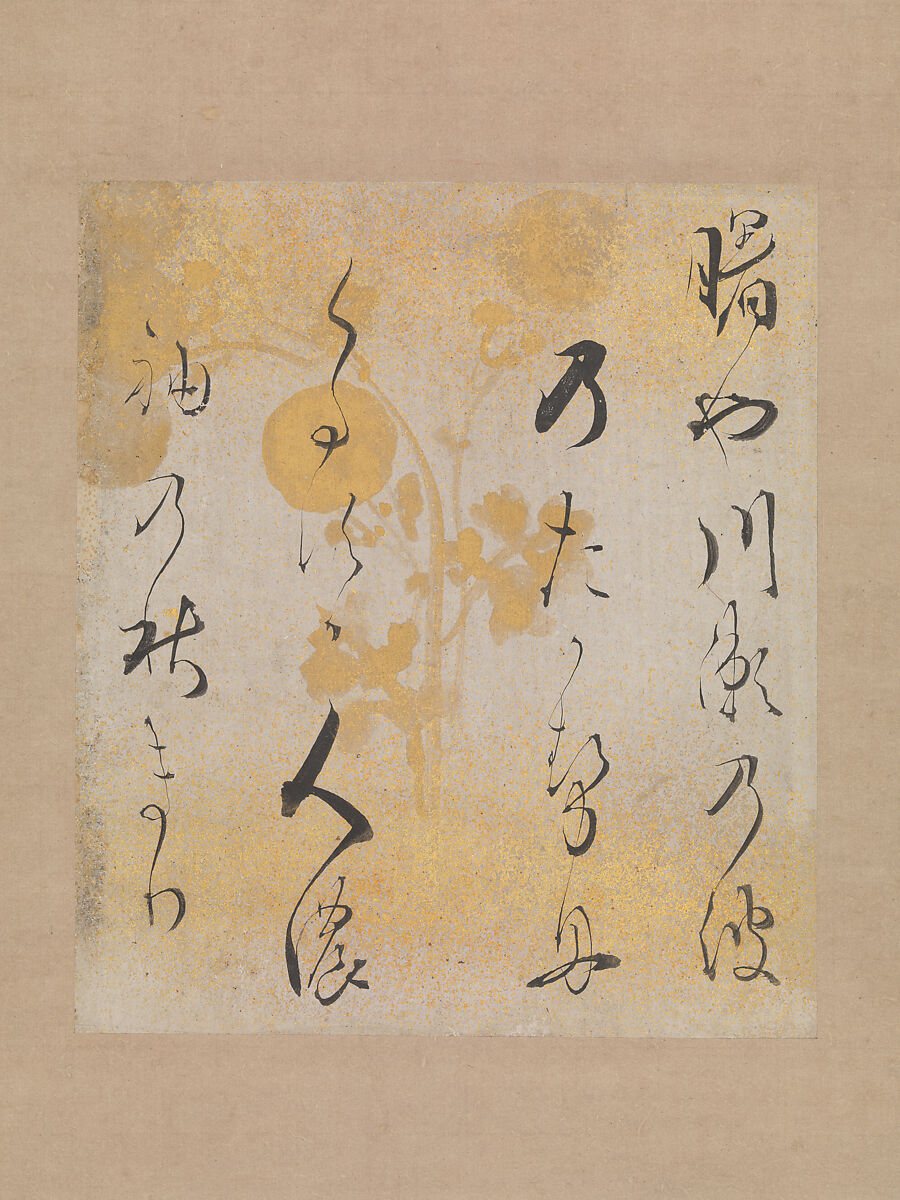 Against an extravagant design of chrysanthemums and mist rendered in gold flakes and gold dust, the most famous calligrapher of his age, Hon’ami Kōetsu, has inscribed a single waka (31-syllable court verse) by Minamoto no Michiteru (Koga Michiteru, 1187-1248), a high-ranked courtier-poet of ancient times, whose poems, including the one cited here, were included in distinguished imperially sponsored anthologies such as the New Collection of Japanese Poems Ancient and Modern (Shin kokin wakashu). Evoking the autumn season in the capital, the verse here reads: