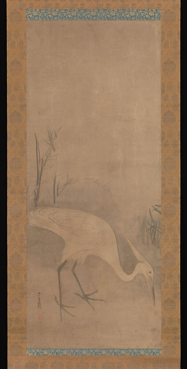 The softness and calm seen in this rendering of a solitary white heron amid reeds would become a hallmark of Rinpa ink painting modes used to render animals or Buddhist and Daoist sages, in distinct contrast to the brightly colored compositions on floral or arboreal themes for which Sōtatsu and his successors Ogata Kōrin in the eighteenth century and Sakai Hōitsu in the nineteenth century became famous. The pale and seemingly hazy outlines of this monochrome ink painting may at first appear to have been brushed in a rather casual manner, but closer examination reveals the verve and expert control of the brush the artist had.
