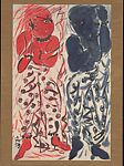 Munakata’s immersion into Buddhist philosophy and art led him to create works on themes such as this pair of boy attendants (dōji) who would have flanked Fudō Myōō or other Buddhist deities in more conventional iconography. Here the acolytes rendered in dynamic brushwork in rich blue-ink and phosphorescent orange-red. One of the acolytes has his hands in the namaskara mudra, the other with an upraised arm, a symbol of protection.