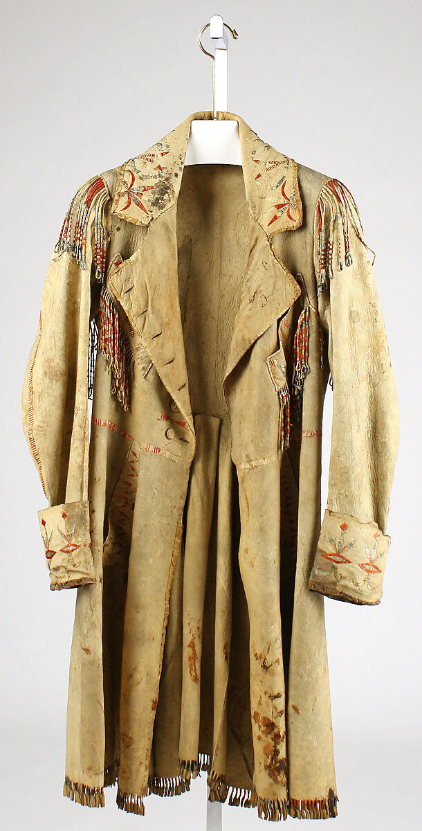 The "noble savage" is a conceit of the Enlightenment, evidence of the imperialist dialectic between "civilized" Europeans and the "uncivilized" inhabitants of the new and exotic colonies. A common consequence of colonization was the fusion of Western and indigenous dress, as can be seen in the fringed coat of the Métis of North America. Cut in the style of a nineteenth-century frock coat, it is made from buckskin ornamented with floral motifs and roundels.