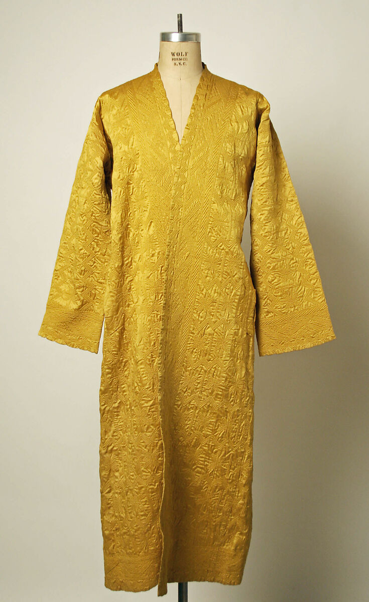 This type of garment is characteristic of the dresses and textiles from Syria which is known for its luxurious silks that were produced in the large urban workshops of Aleppo and Damascus in the nineteenth and early twentieth centuries. Coats like this example are made of fine satin silk and quilted in vertical bands of stylized floral bands or geometric stripes, often with borders of zigzag or other simple repeat designs. Open to the front, these garments have long sleeves and often have pockets on the sides. An inner lining in simple undyed cotton protects the outer fabric and provides additional padding. Although white to yellow quilted coats seem to be more popular, blue, and red examples are known as well. Such coats were intended for Syrian women and girls from wealthy families living in urban centers. Typically worn after bathing, such luxurious coats were among the preferred garments in the bridal trousseau. Research also suggests that similar quilted coats were preferred by the Sufi Shaykhs in Anatolia and worn as a hırka coat over layers of clothing. Sources confirm that these coats that were worn in Anatolia are referred to as hırka coats "from Syria". The Syrian denomination of the Sufi coats speaks to Syria’s fame of fine clothing and silk manufacture.