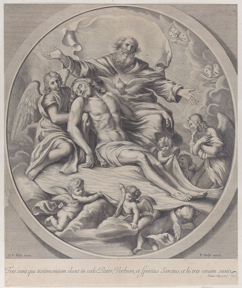 - Title:The Holy Trinity, with the dead Christ at center surrounded by angels, God the Father, and the Holy Spirit